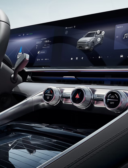 Das Infotainment-System des Omoda 9 fokussiert auf Übersichtlichkeit, Konnektivität und Bedienkomfort. Zwei nahtlos verbundene 12,3-Zoll-Displays bilden das zentrale Interface. Sie zeigen Fahrdaten, Navigation und Medieninhalte an. Integriert sind Apple CarPlay und Android Auto, ebenso ein Head-Up-Display und ein 540°-Kamerasystem. Alle Infos sind genau im Blick, die Aufmerksamkeit bleibt dort, wo sie hingehört: auf der Straße.